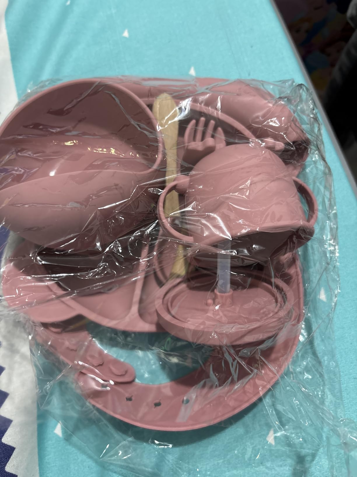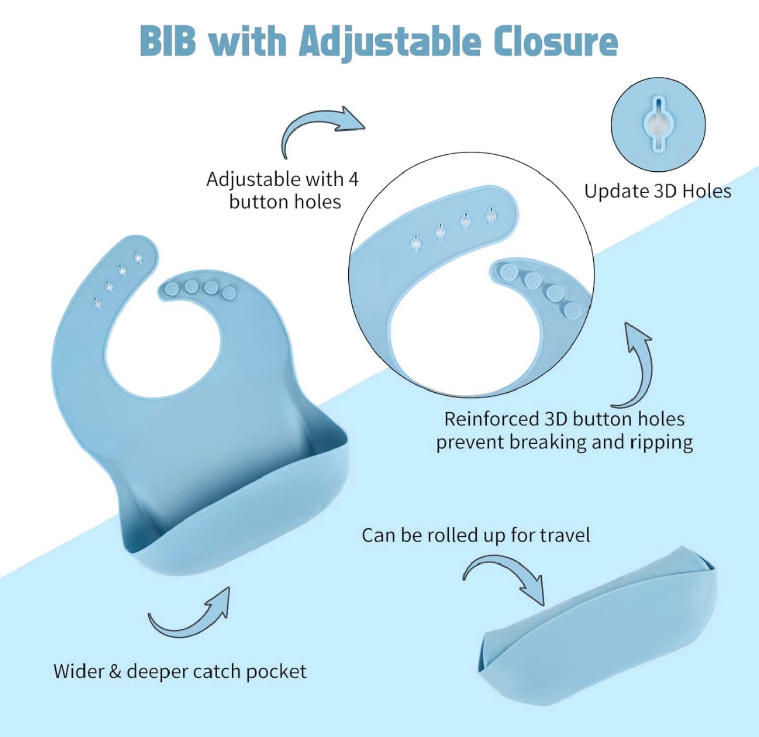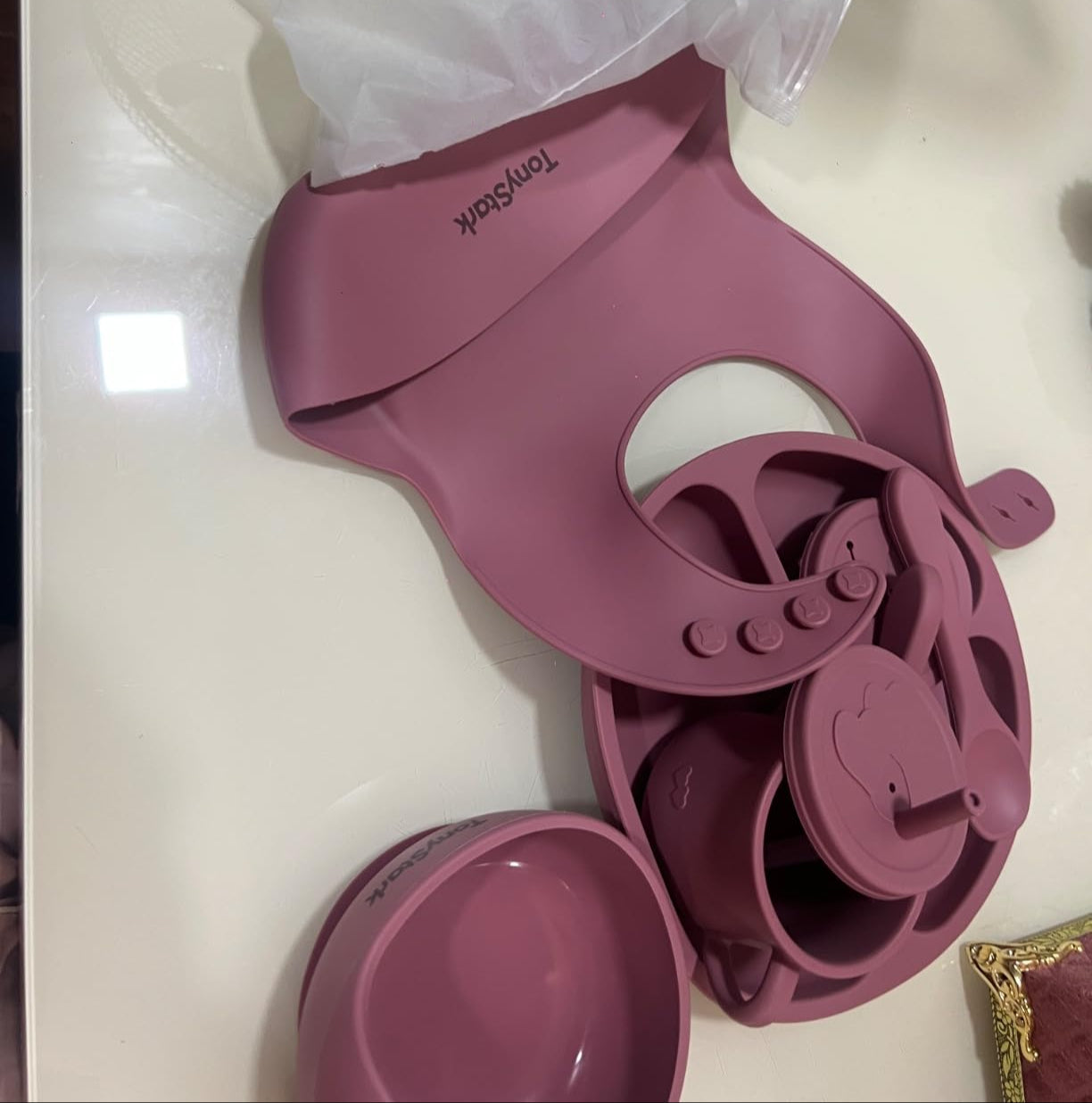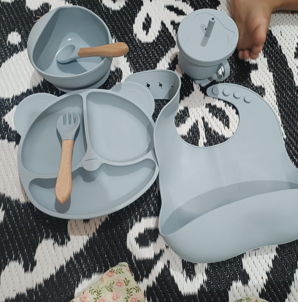 This product is a 6PCS Silicone Baby Feeding Set, which includes a suction plate, bowl, bib, spoon, fork, and cup — everything you need to make feeding time easier and mess-free!
