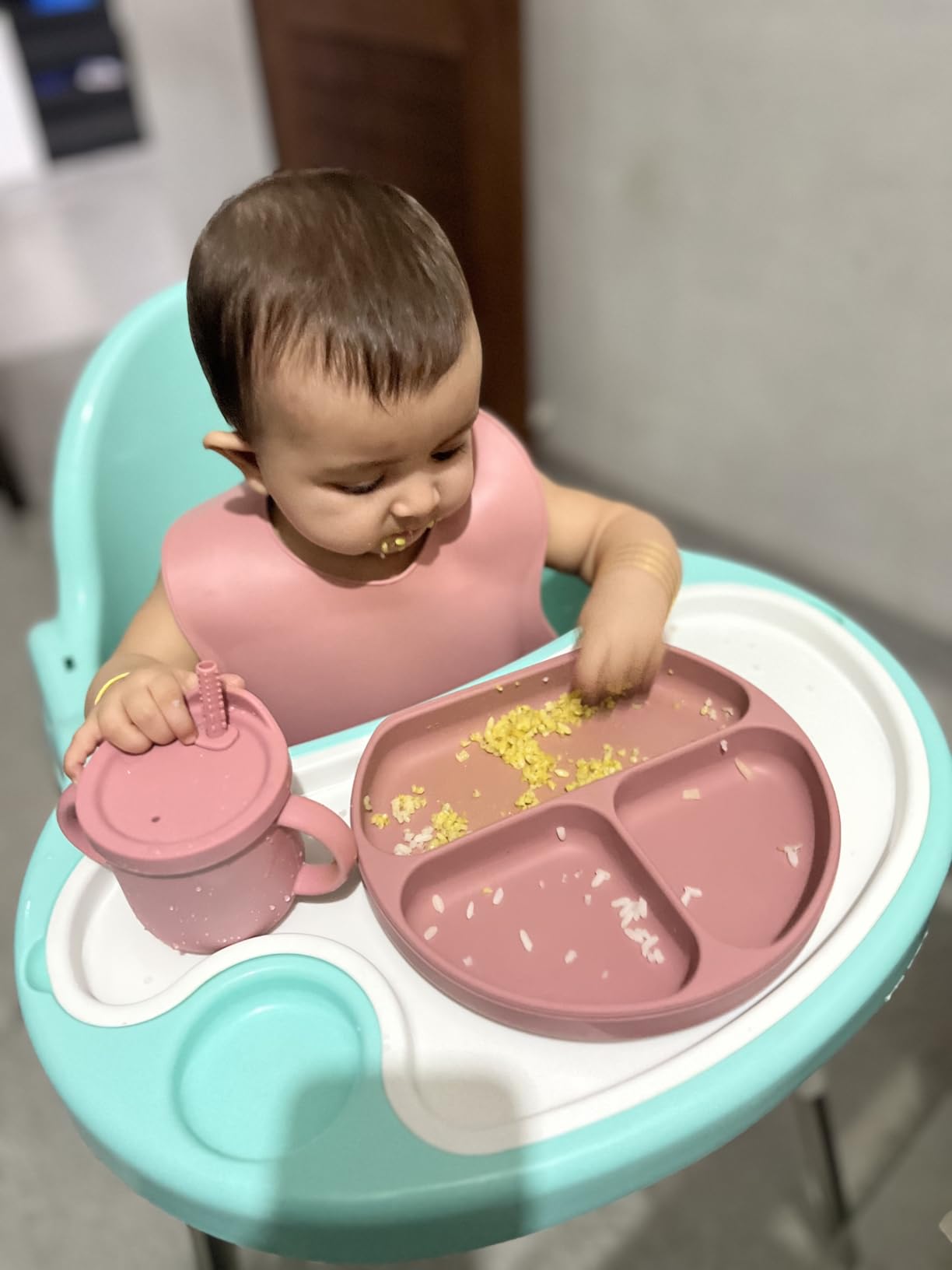 The mat is suitable for babies starting solids (around 6 months+) and works great for toddlers too.